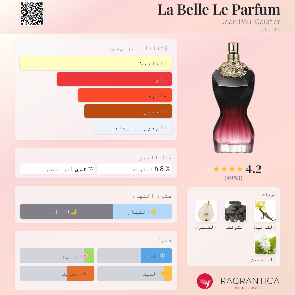 La Belle Le Parfum Jean Paul Gaultier عطر شرقي - فانيليا للنساء . La Belle Le Parfum صدر عام 2021. La Belle Le Parfum من توقيع Quentin Bisch و Sonia Constant. إفتتاحية العطر الكمثري; قلب العطر حبوب التونكا و الياسمين; قاعدة العطر من الفانيليا.