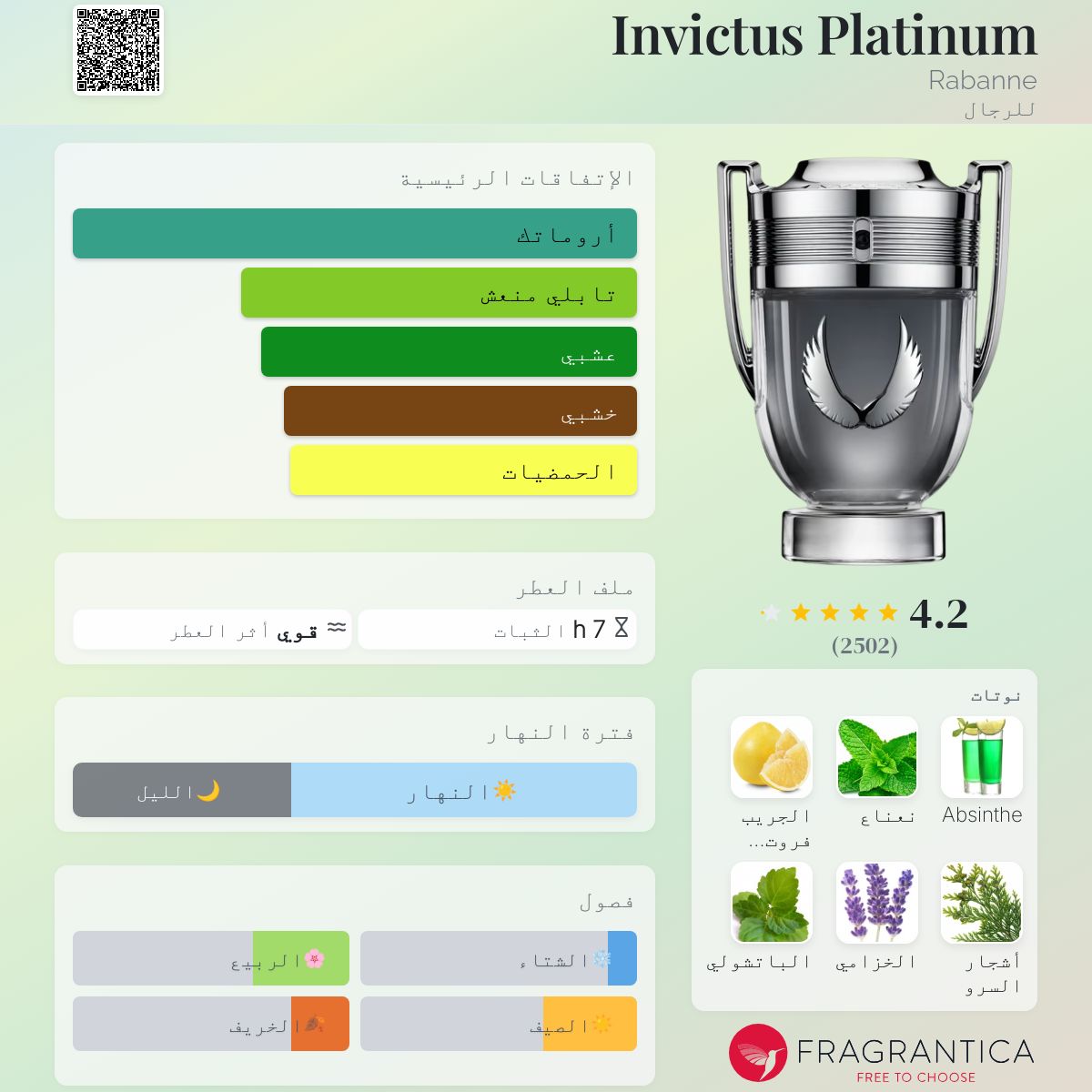 Invictus Platinum Rabanne عطر خشبي - أروماتك للرجال . Invictus Platinum صدر عام 2022. إفتتاحية العطر شراب الأفسنتين و الجريب فروت; قلب العطر النعناع و الخزامي; قاعدة العطر تتكون من أشجار السرو و الباتشولي.