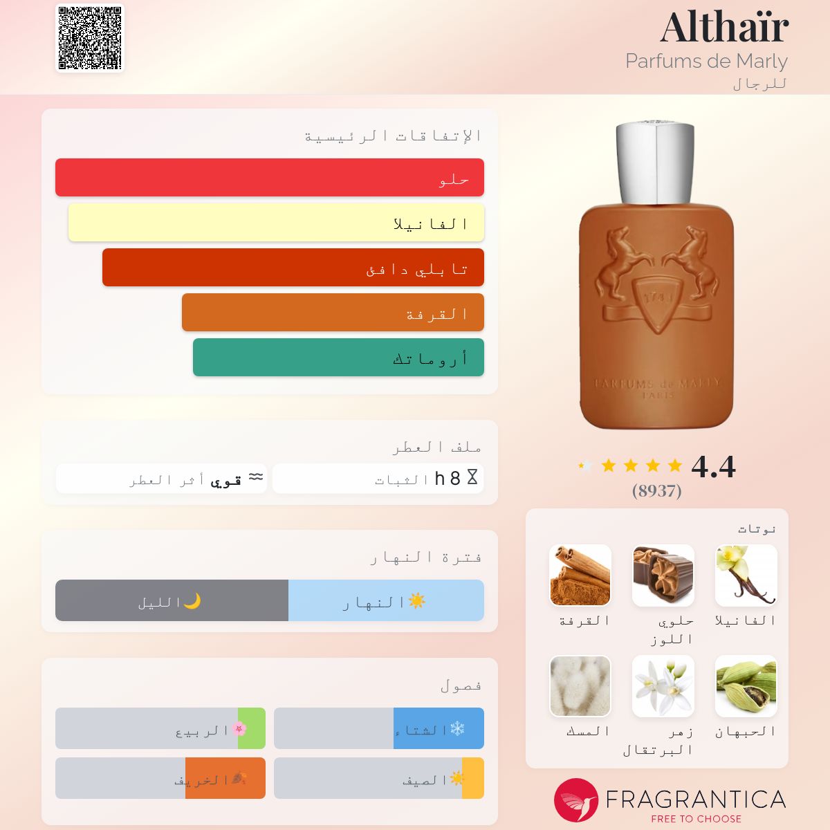 عطر شرقي - فانيليا للرجال . Althaïr صدر عام 2023. Althaïr من توقيع Hamid Merati-Kashani و Ilias Ermenidis. إفتتاحية العطر القرفة, الهيل, زهر البرتقال و البرغموت; قلب العطر فانيليا بوربون و الإليمي; قاعدة العطر تتكون من حلوي اللوز, المسك, الأمبروكسان, أخشاب الغاياك, حبوب التونكا و اللوز المحلى.