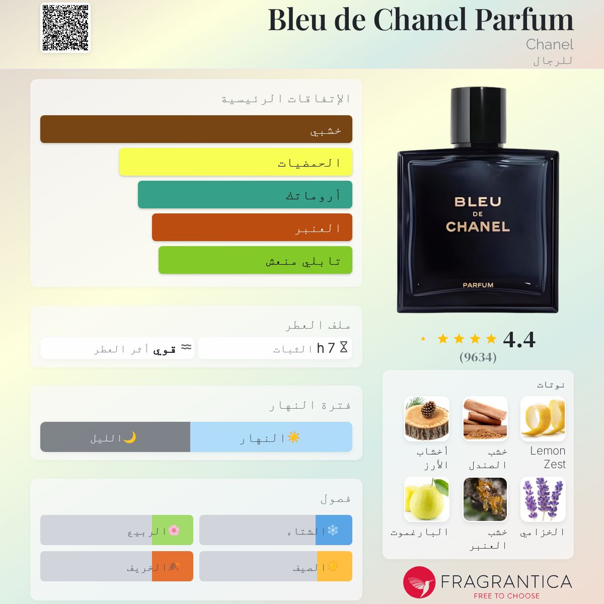 عطر خشبي - أروماتك للرجال . Bleu de Chanel Parfum صدر عام 2018. Olivier Polge قام بتوقيع هذا العطر. إفتتاحية العطر بشر الليمون, البرغموت, النعناع و الشيح; قلب العطر الخزامي, الأناناس, إبره الراعي و النوتات الخضراء; قاعدة العطر تتكون من خشب الصندل, خشب الأرز, خشب العنبر, أيزو إي سوبر و حبوب التونكا.