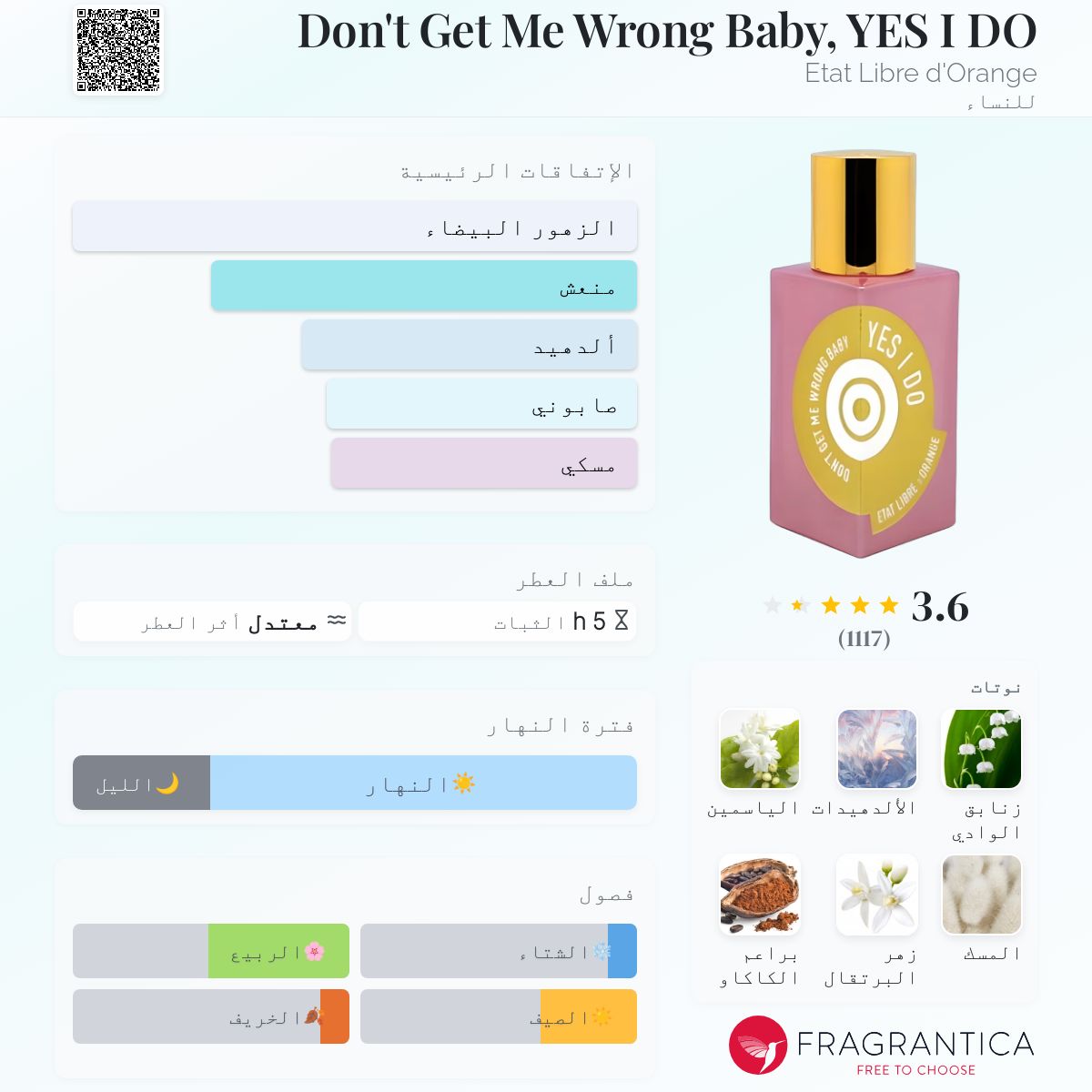 عطر تشيبر - زهري للنساء . Don't Get Me Wrong Baby, YES I DO صدر عام 2016. إفتتاحية العطر زنابق الوادي, الألدهيدات و الكمثري; قلب العطر الياسمين, زهر البرتقال و الفاوانيا; قاعدة العطر تتكون من المسك, الكاكاو و خشب الأرز.