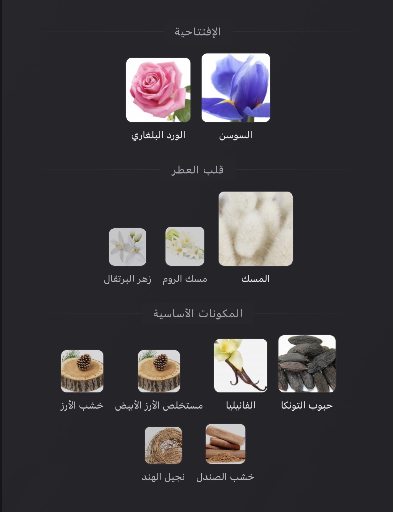 عطر زهري - خشبي - مسك للنساء . Narciso Rouge صدر عام 2018. Narciso Rouge من توقيع Nadege le Garlantezec و Sonia Constant. إفتتاحية العطر السوسن و الورد البلغاري; قلب العطر المسك, مسك الروم و زهر البرتقال; قاعدة العطر تتكون من حبوب التونكا, الفانيليا, مستخلص الأرز الأبيض, خشب الأرز, خشب الصندل و نجيل الهند.