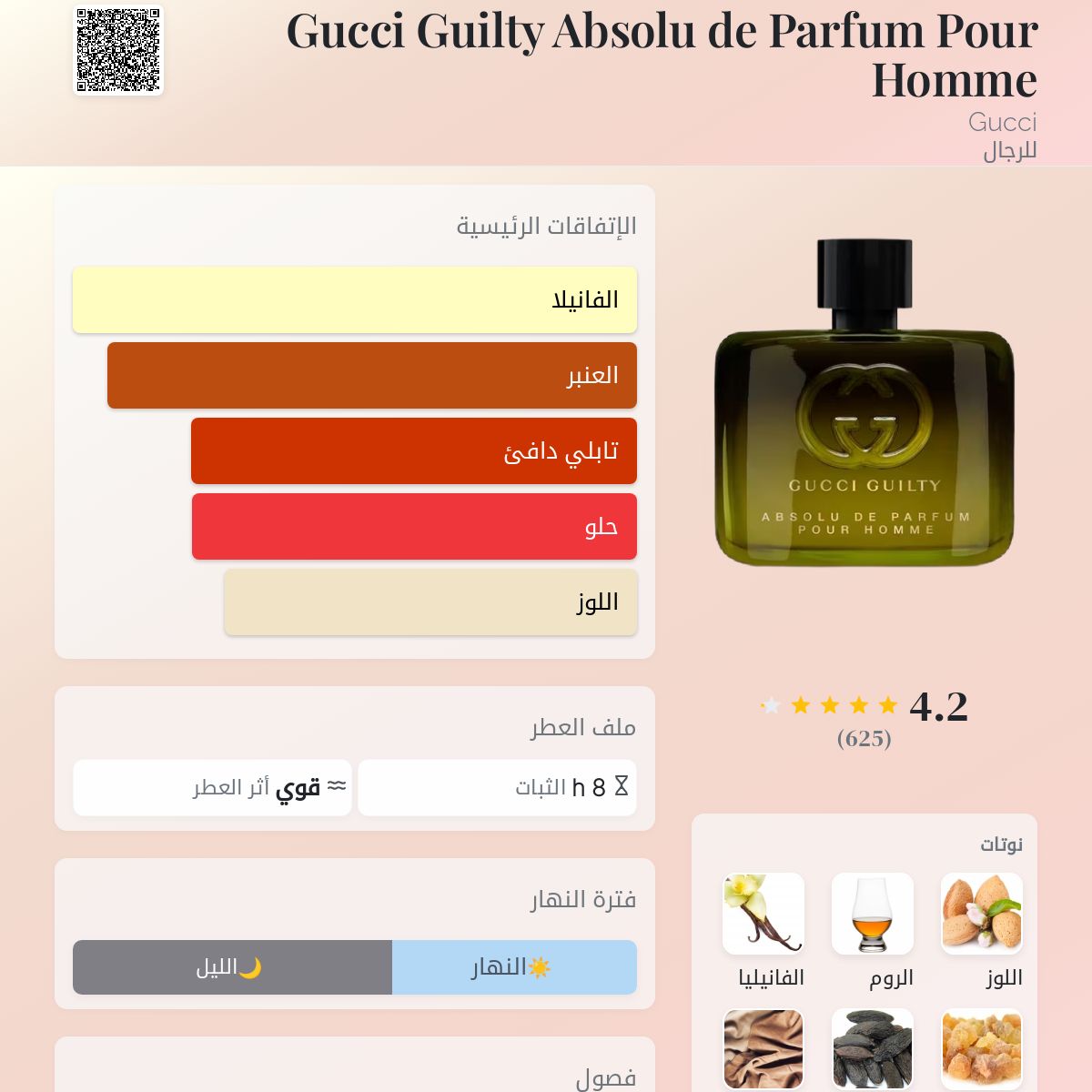 عطر شرقي - حار للرجال . هذا عطر جديد Gucci Guilty Absolu de Parfum Pour Homme صدر عام 2025. إفتتاحية العطر اللوز, الروم, زهر البرتقال و البرغموت; قلب العطر حبوب التونكا, الفلفل الأحمر الحار, اللابدانوم و النيرولي; قاعدة العطر تتكون من الفانيليا, البنزوين - الجاوي و الجلود.