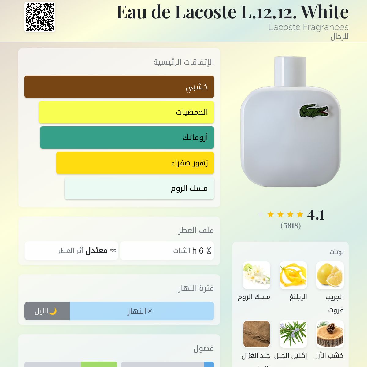 Eau de Lacoste L.12.12. White Lacoste Fragrances عطر خشبي - أروماتك للرجال . Eau de Lacoste L.12.12. White صدر عام 2011. إفتتاحية العطر الجريب فروت, إكليل الجبل و الهيل; قلب العطر الإيلنغ و مسك الروم; قاعدة العطر تتكون من خشب الأرز من فرجينيا, جلد الغزال (الجلد المدبوغ), نجيل الهند و الجلود.