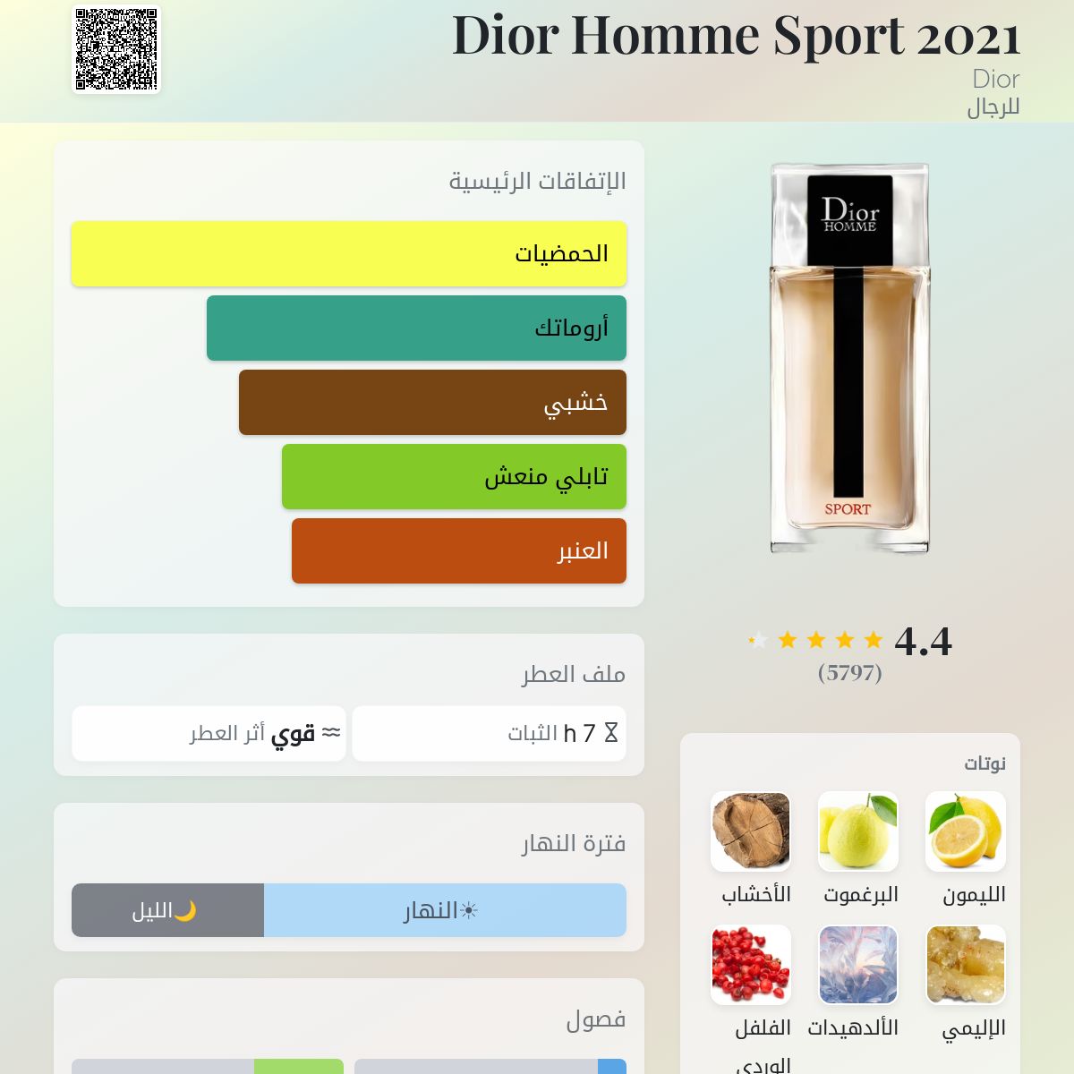 عطر خشبي - حار للرجال . Dior Homme Sport 2021 صدر عام 2022. François Demachy قام بتوقيع هذا العطر. إفتتاحية العطر الليمون, البرغموت و الألدهيدات; قلب العطر الإليمي و الفلفل الوردي; قاعدة العطر تتكون من الأخشاب, العنبر و اللبان.