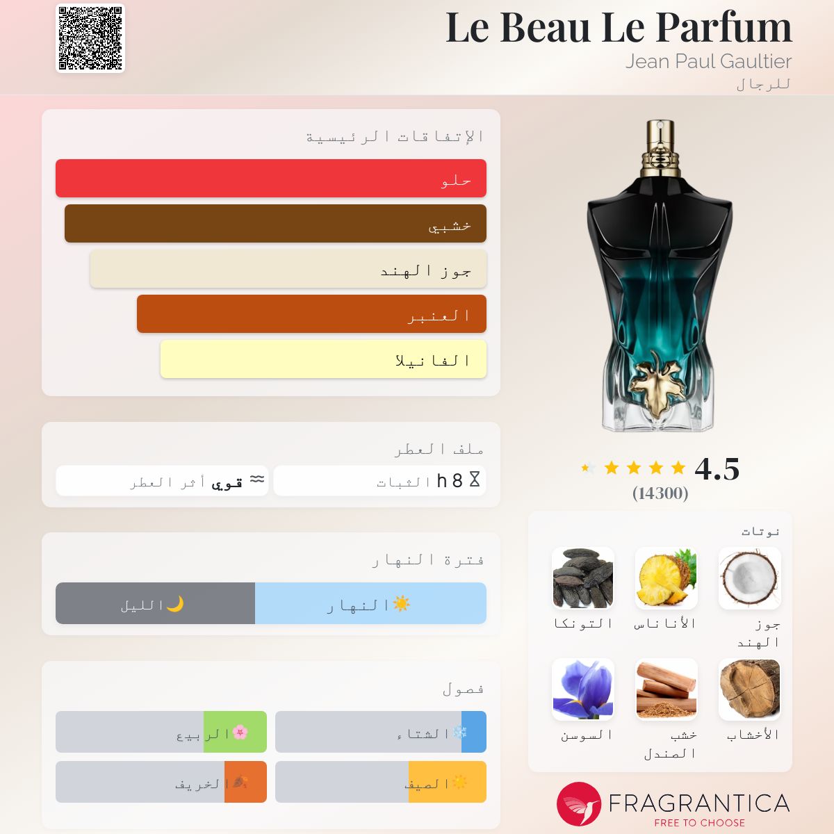 Le Beau Le Parfum Jean Paul Gaultier عطر شرقي - خشبي للرجال . Le Beau Le Parfum صدر عام 2022. Quentin Bisch قام بتوقيع هذا العطر. إفتتاحية العطر الأناناس, السوسن, الزنجبيل و أشجار السرو; قلب العطر جوز الهند و الأخشاب; قاعدة العطر تتكون من حبوب التونكا, خشب الصندل, العنبر و الآمبرغريس.