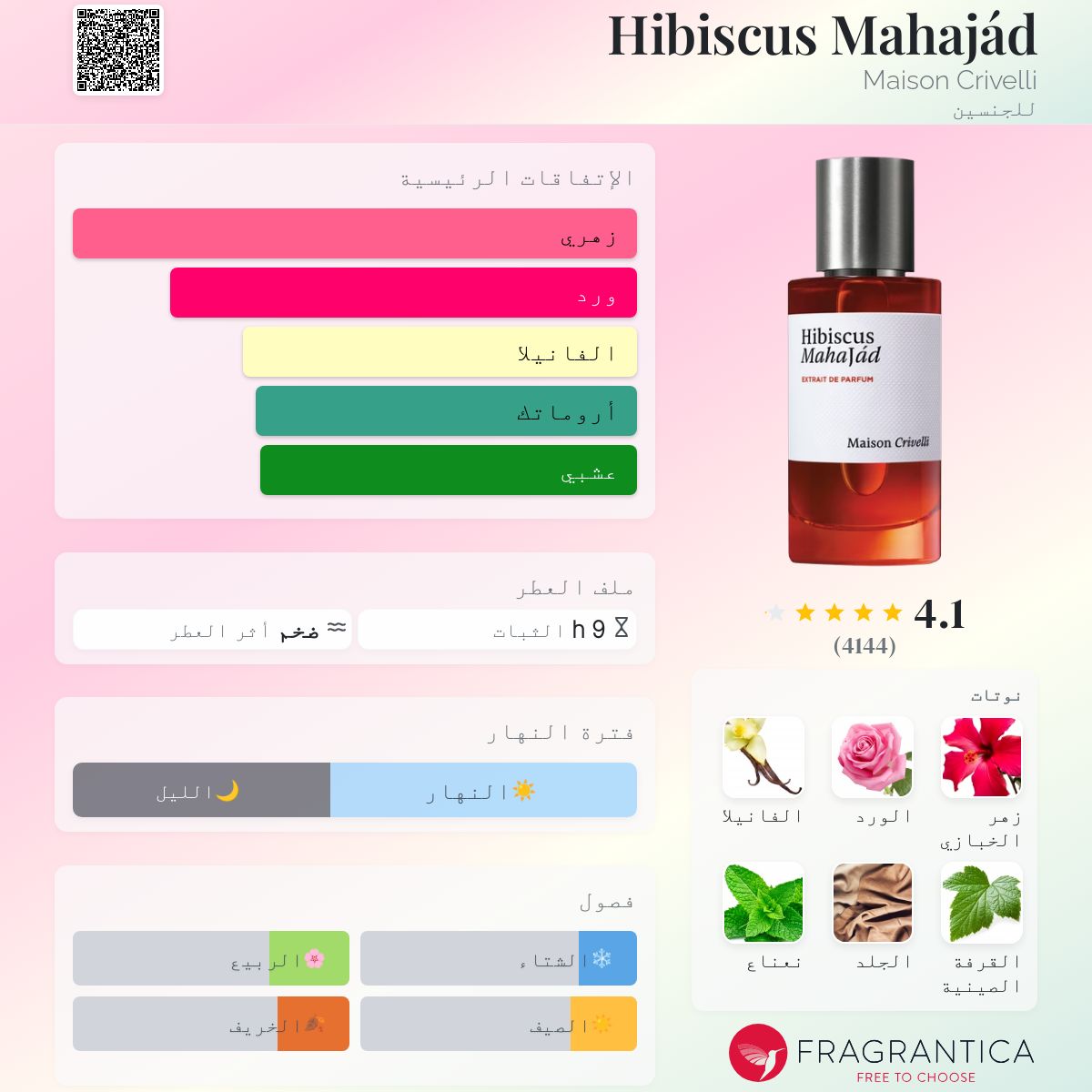 Hibiscus Mahajád Maison Crivelli عطر للجنسين. Hibiscus Mahajád صدر عام 2021. Quentin Bisch قام بتوقيع هذا العطر.مكونات العطر الكركدية ، الورد الدمشقي ، الفانيليا ، اوراق القرفة الصينية ، الجلود ، النعناع الحار ، الامبريت ، القرفه.