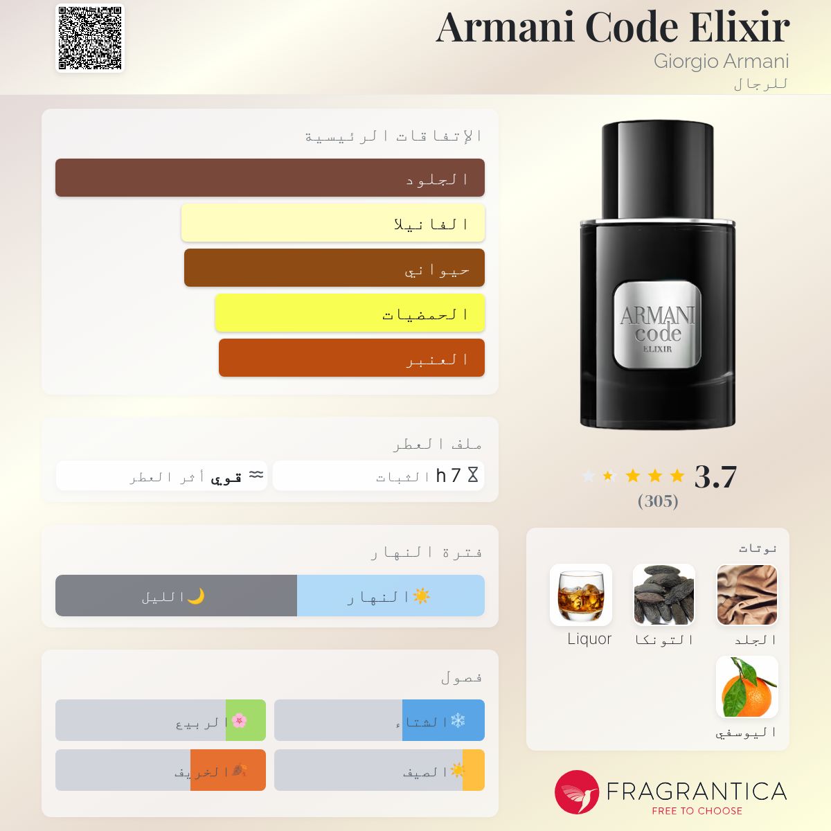 Armani Code Elixir Giorgio Armani عطر شرقي - فوچير للرجال . هذا عطر جديد Armani Code Elixir صدر عام 2025. إفتتاحية العطر الماندرين الأخضر; قلب العطر الجلود و الخمر; قاعدة العطر من حبوب التونكا.