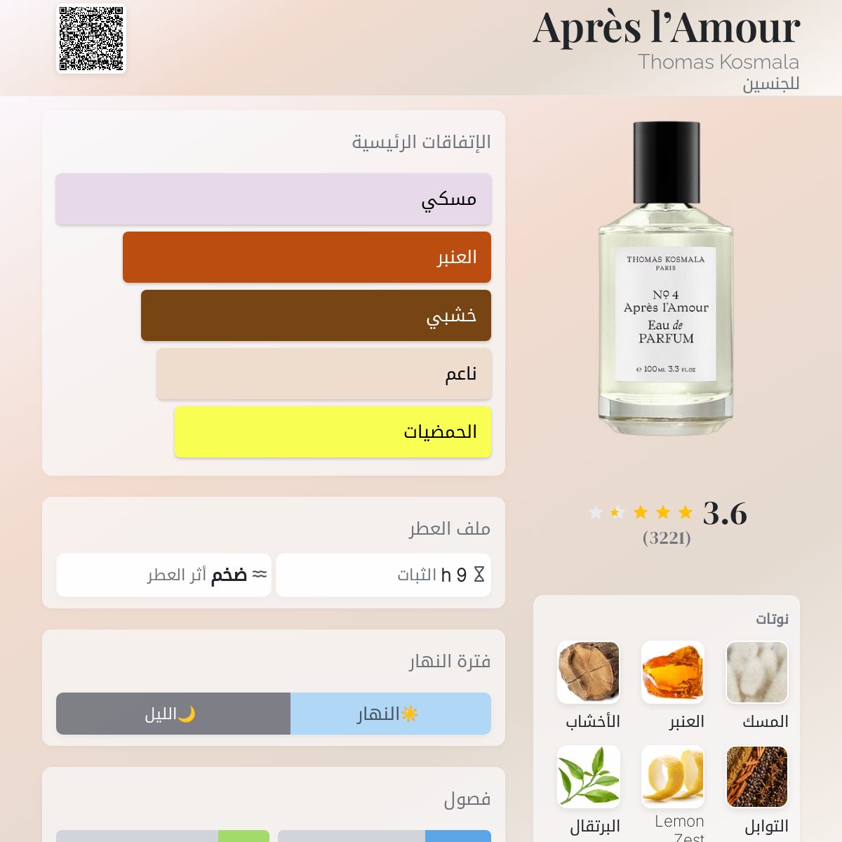 عطر خشبي - أروماتك للجنسين. Après l’Amour صدر عام 2018. Thomas Kosmala قام بتوقيع هذا العطر. إفتتاحية العطر بشر الليمون و زهر البرتقال المر; قلب العطر التوابل العطرية; قاعدة العطر تتكون من المسك, العنبر و الأخشاب.