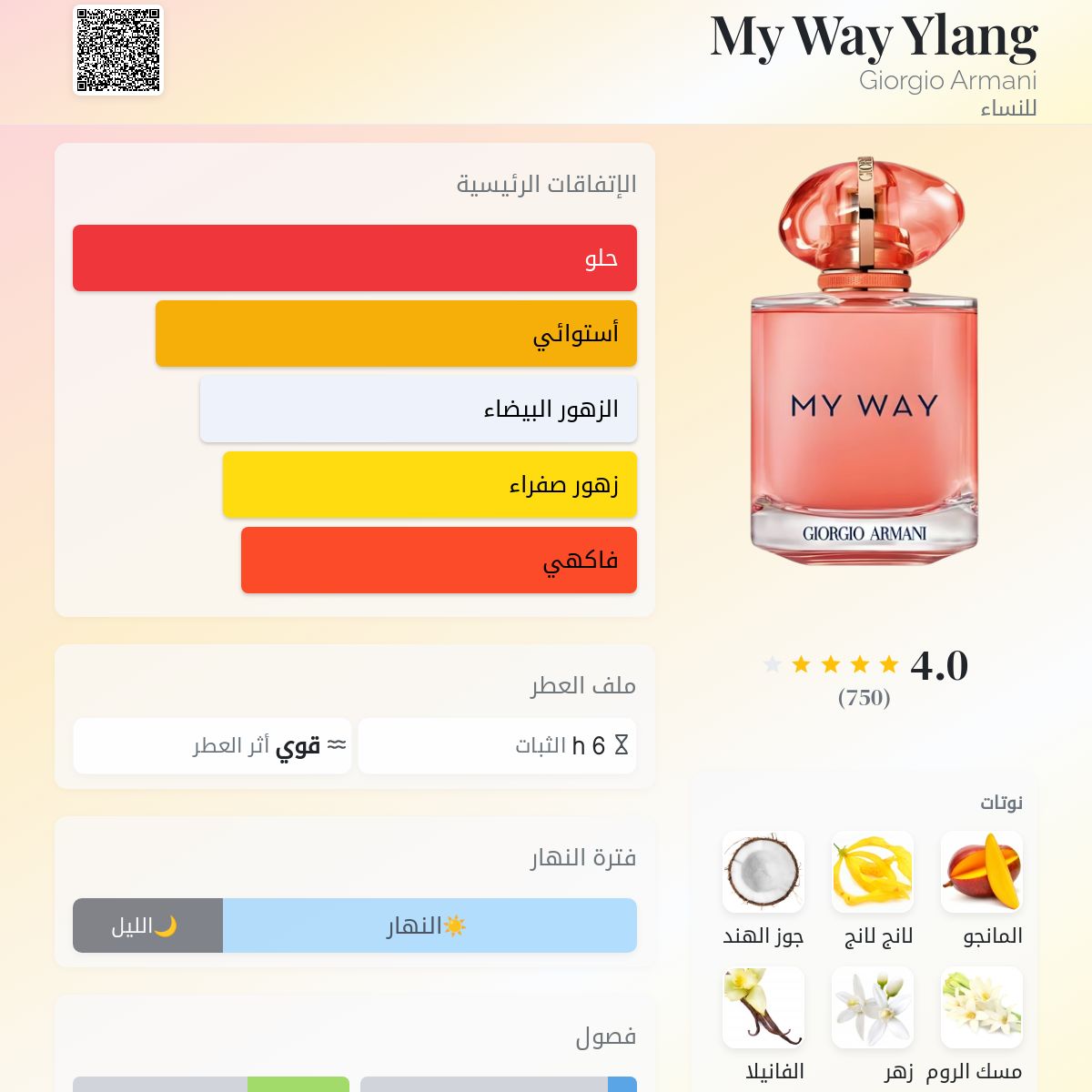 عطر زهري - فواكه للنساء . هذا عطر جديد My Way Ylang صدر عام 2024. إفتتاحية العطر المانجو, جوز الهند, زهر البرتقال و البرغموت; قلب العطر الإيلنغ و مسك الروم; قاعدة العطر تتكون من الفانيليا, المسك الأبيض و خشب الأرز.