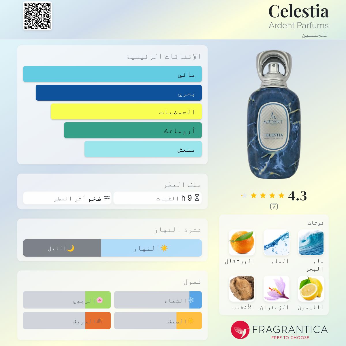 عطر أروماتك - مائي للجنسين. هذا عطر جديد Celestia صدر عام 2024. إفتتاحية العطر البرتقال و الليمون; قلب العطر الزعفران, الأخشاب و الورد; قاعدة العطر تتكون من نسيم البحر, رائحه الماء, العنبر و الباتشولي.