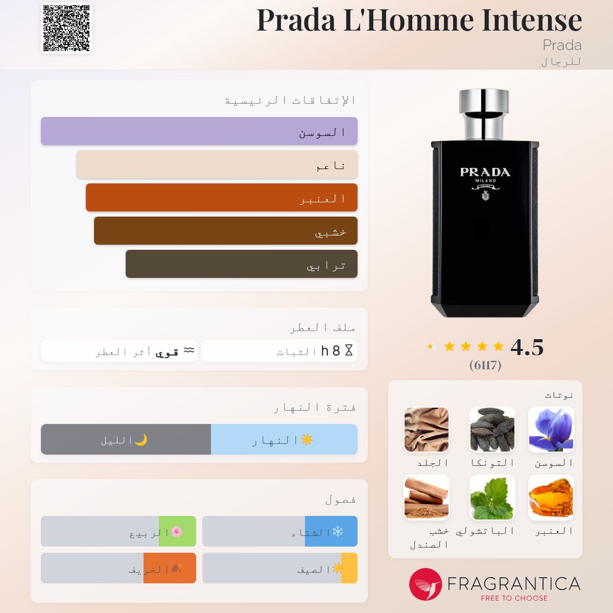 Prada L'Homme Intense Prada عطر شرقي - خشبي للرجال . Prada L'Homme Intense صدر عام 2017. Daniela Andrier قام بتوقيع هذا العطر. إفتتاحية العطر السوسن; قلب العطر العنبر و الباتشولي; قاعدة العطر تتكون من حبوب التونكا, الجلود و خشب الصندل.