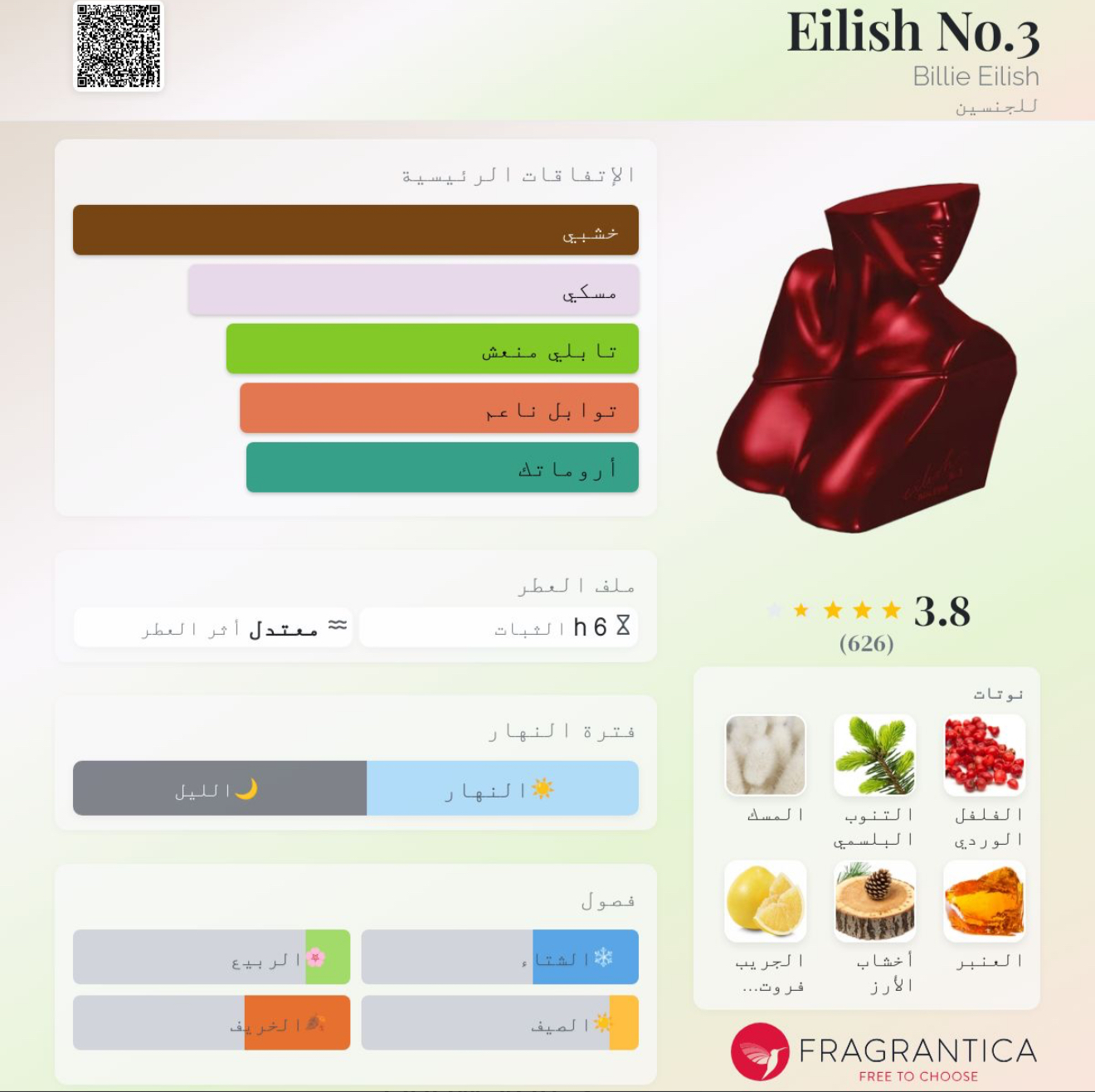 Eilish No.3 Billie Eilish عطر شرقي - خشبي للجنسين. Eilish No.3 صدر عام 2023. Linda Chinery قام بتوقيع هذا العطر. إفتتاحية العطر الفلفل الوردي, الجريب فروت و الياسمين; قلب العطر التنوب, خشب الأرز و الزعفران; قاعدة العطر تتكون من المسك, العنبر و طحلب البلوط (طحلب السنديان).
